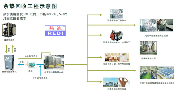 空氣壓縮機(jī)產(chǎn)生熱能,不僅營運(yùn)成本高,而且環(huán)境污染極為嚴(yán)重,如將該部分熱能回收利用于企業(yè)生活采暖、工業(yè)用水、熱水空調(diào)。從而為社會企業(yè)解決使用熱水之可觀經(jīng)濟(jì)負(fù)擔(dān)。