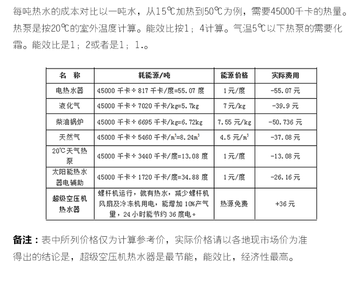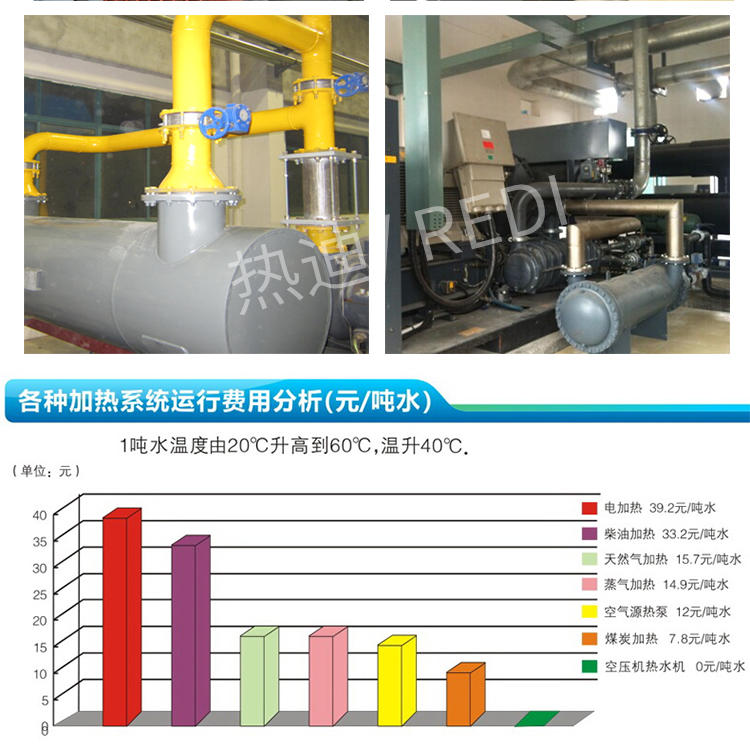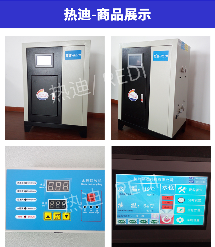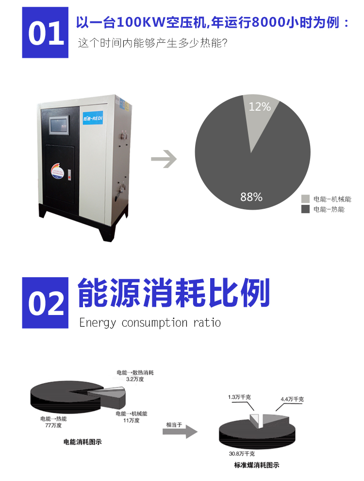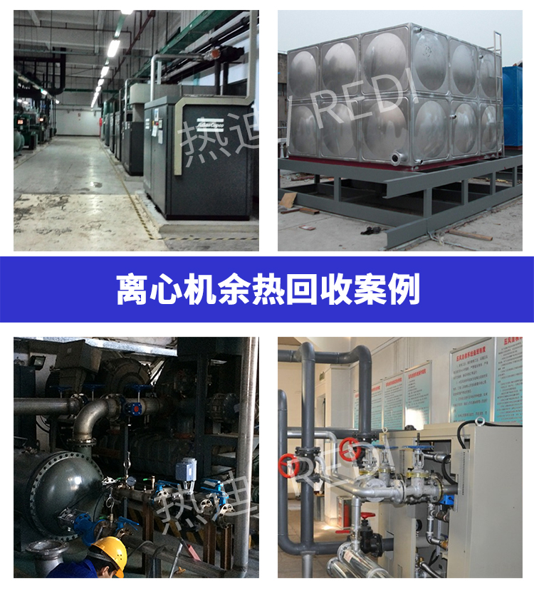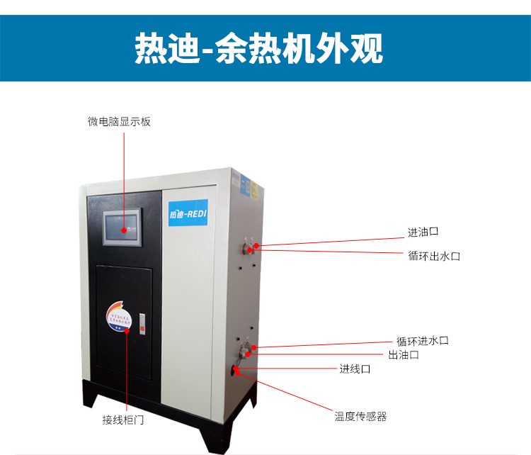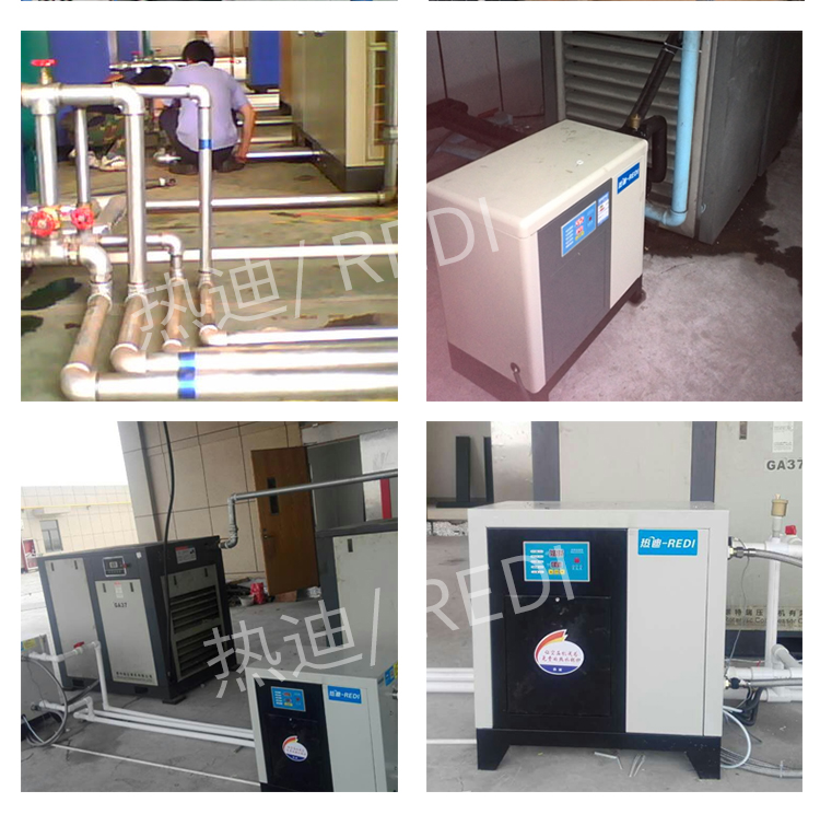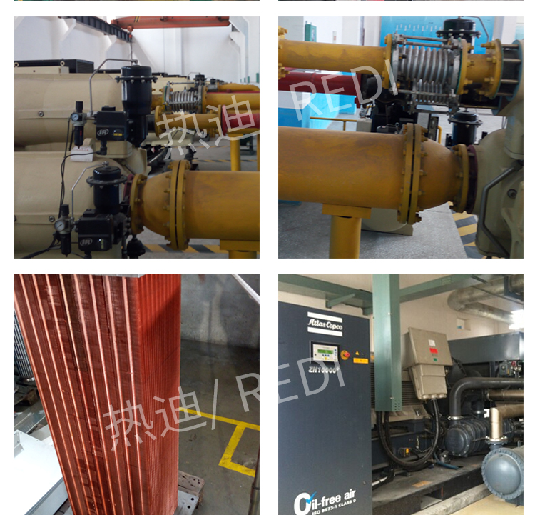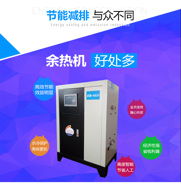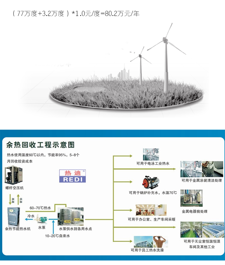螺桿式空氣壓縮機(jī)(簡(jiǎn)稱空壓機(jī))的工作流程如下:空氣通過(guò)進(jìn)氣過(guò)濾器將大氣中的灰塵或雜質(zhì)濾除后,由進(jìn)氣控制閥進(jìn)入壓縮機(jī)主機(jī),在壓縮過(guò)程中與噴入的冷卻潤(rùn)滑油混合,經(jīng)壓縮后的混合氣體從壓縮腔排入油氣分離罐,從而分別得到高溫高壓的油、氣。由于機(jī)器工作溫度的要求,這些高溫高壓的油、氣必須送入各自的冷卻系統(tǒng),其中壓縮空氣經(jīng)冷卻器冷卻后,最后送入使用系統(tǒng);而高溫高壓的潤(rùn)滑油經(jīng)冷卻器冷卻后,返回油路進(jìn)入下一輪循環(huán);根據(jù)計(jì)算,在上述過(guò)程中,高溫高壓的油、氣所攜帶的熱量大約相當(dāng)于空氣壓縮機(jī)功耗的3/4的轉(zhuǎn)化熱量,余熱溫度通常在80℃—100℃之間。螺桿式空氣壓縮機(jī)通過(guò)其自身的散熱系統(tǒng)來(lái)給高溫高壓的油、氣降溫的過(guò)程中,大量的熱能就被無(wú)端的浪費(fèi)了;在提倡建設(shè)節(jié)約型社會(huì)的大趨勢(shì)下,這種浪費(fèi)無(wú)疑與我們的價(jià)值觀念背道而馳,如何回收利用這些余熱,成為本領(lǐng)域技術(shù)人員所急待解決的一個(gè)技術(shù)問(wèn)題。 熱迪為了充分利用螺桿式空壓機(jī)所產(chǎn)生的余熱, 我司經(jīng)過(guò)多年的技術(shù)積累研發(fā)出一套余熱回收裝置,利用該裝置對(duì)螺桿式空氣壓縮機(jī)所產(chǎn)生的高溫高壓的潤(rùn)滑油進(jìn)行冷卻處理,不僅可以提高空氣壓縮機(jī)的產(chǎn)氣效率,而且可使企業(yè)獲得生產(chǎn)和生活所需的熱水,嚴(yán)冬可加熱到≥55℃,夏秋季節(jié)≥65℃,從而解決了企業(yè)生產(chǎn)熱水的經(jīng)濟(jì)負(fù)擔(dān)。